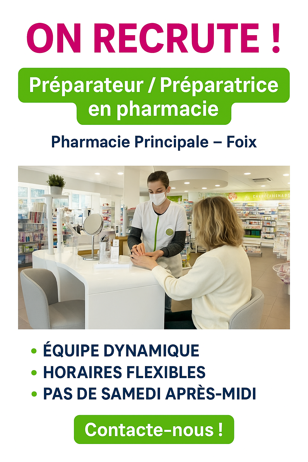 La Pharmacie Principale, située à Foix (09), à 45mn de Toulouse, recherche un préparateur motivé pour rejoindre une équipe dynamique composée de 3 préparatrices et 3 pharmaciens.