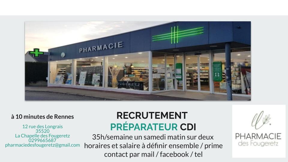 La Pharmacie des Fougeretz (à 10 minutes de Rennes) recherche un préparateur en pharmacie pour un contrat CDI ou CDD